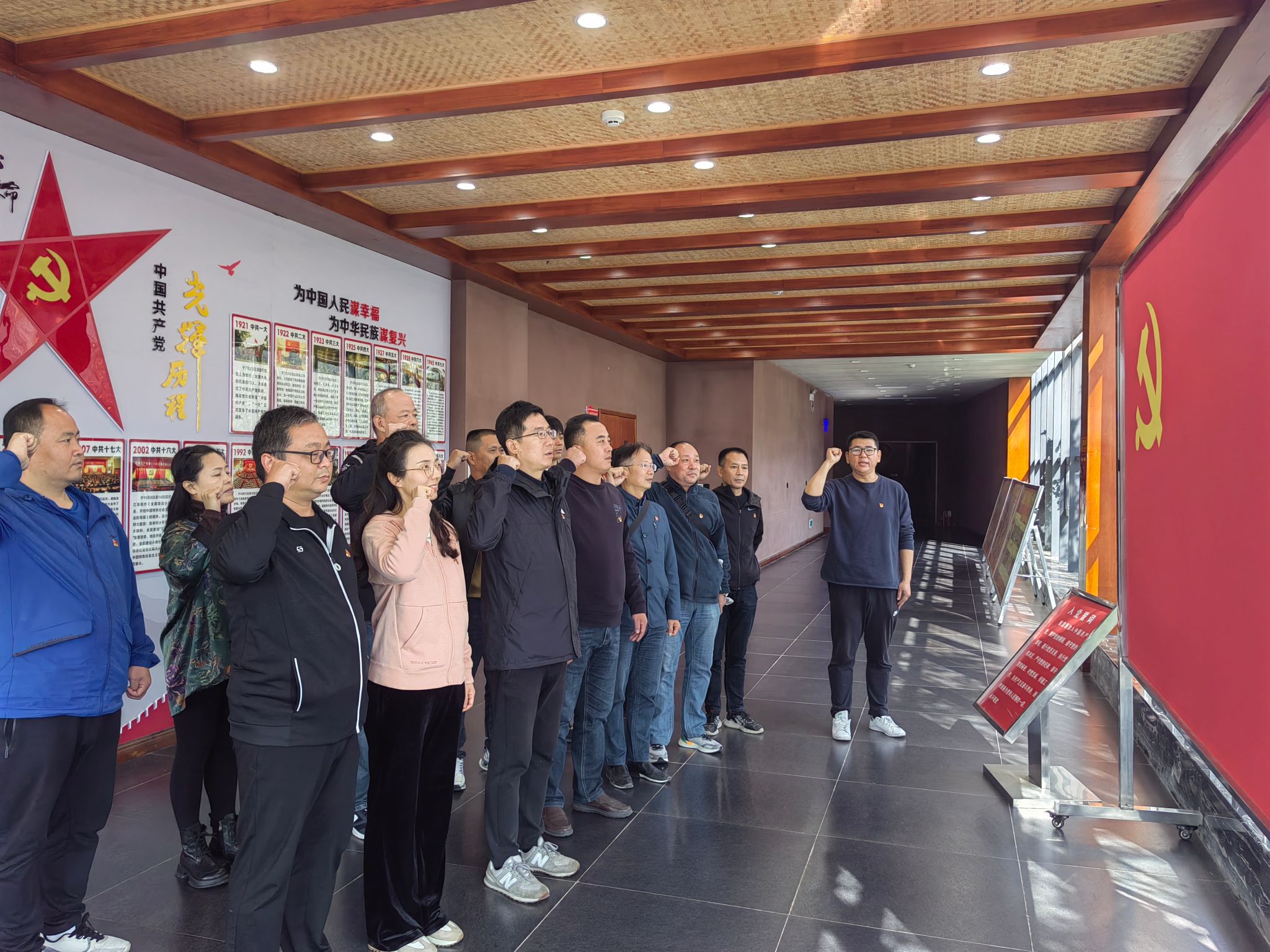 “我志愿加入中国共产党,拥护党的纲领……”在红色教育科技馆内,全体党员面向党旗,重温入党誓词,在铮铮誓言中进一步坚定理想信念、强化对党忠诚,党旗党徽交相辉映,铿锵誓言久久不息。