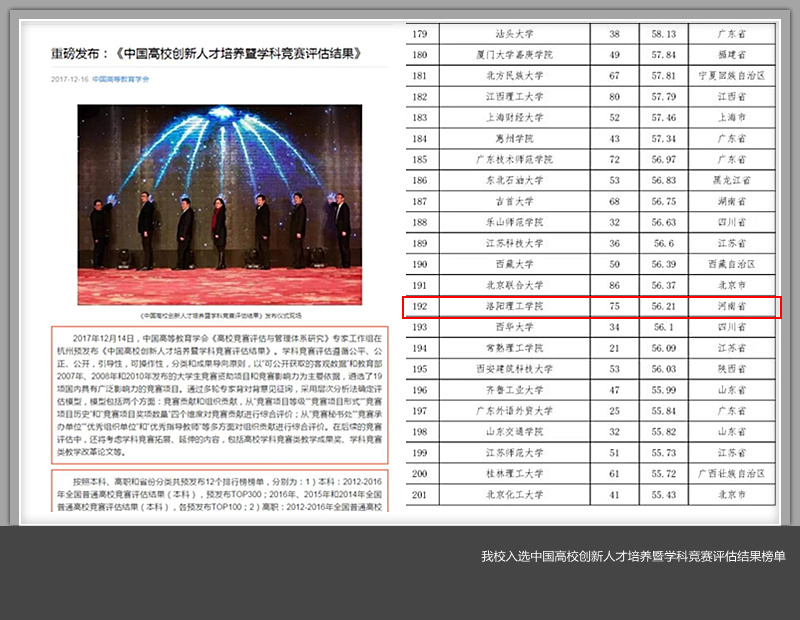 12月14日,中国高等教育学会《高校竞赛评估与管理体系研究》专家工作组按照本科、高职和省份分类发布了《中国高校创新人才培养暨学科竞赛评估结果》。美高梅娱乐场 以75个奖项数量,总成绩56.21分,在2012-2016年全国普通高校竞赛评估结果本科组中全国排名第192位。