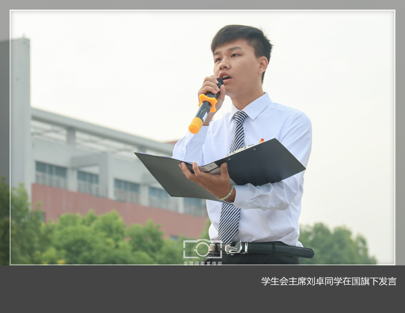 学生会主席刘卓同学在国旗下发言。他说中国从贫穷走向富强、从软弱走向复兴,这一过程创造了举世瞩目的中国奇迹,作为新时代的我们应该不负众望,为祖国伟大复兴贡献出自己的一份力量。
