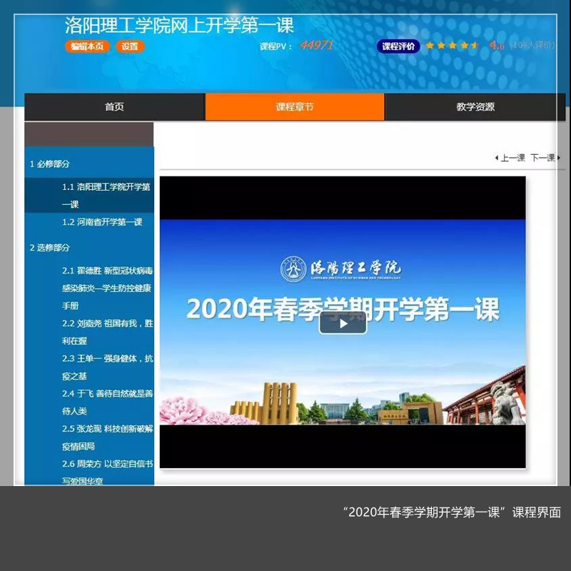 2020春季学期网上开学第一课内容分必修和选修两部分。必修部分包含了奏唱国歌、《人民战“疫”》专题片、省教育厅厅长郑邦山讲话、校党委书记陈岩讲话、校长刘国际讲话、辅导员代表丁晨老师发言和“河南省开学第一课”等内容。选修部分包括省内高校六位专家学者专题讲座。