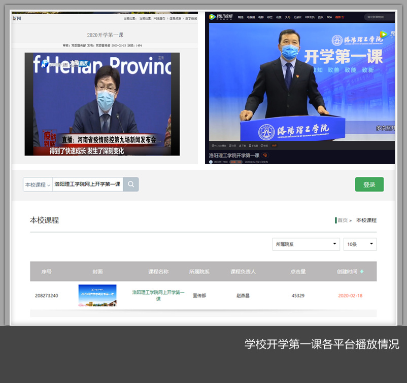 “河南省开学第一课”以歌曲《我的祖国》开篇,围绕抗击新冠肺炎,以“继承传统,爱国爱校,做好防控,保质提效”为主题,来自抗疫一线、教育一线和百家讲坛的八位省内高校名师担任主讲嘉宾分八个主题分享了自己的真知灼见。内容涵盖突发事件与应急响应、公共卫生突发事件应对国际比较、历史视角看瘟疫、新型冠状肺炎学生防控保健、依法治疫,守法抗疫、做好心理防护,理性面对疫情、坚持制度优势,让党的旗帜飘起来。选修课部分,新乡医美高梅娱乐场