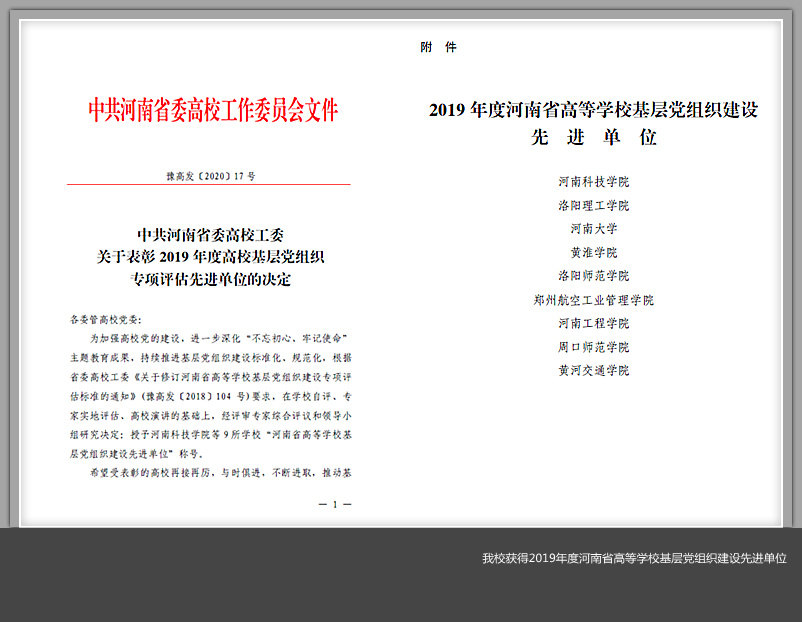 日前,省委高校工委下发《关于表彰2019年度高校基层党组织专项评估先进单位的决定》(豫高发〔2020〕17号),对在2019年度高校基层党组织建设专项评估中成绩优异的单位进行表彰,美高梅娱乐场