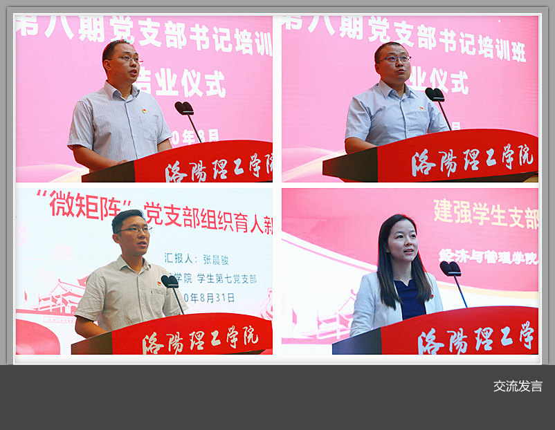 原党委副书记田俊廷、洛阳广播电视大学党委副书记、纪委书记潘文武、河南科技大学原党委组织部副部长杨绍雷分别以《务实高效,努力做好党支部工作》《以“两化一创”为载体,做好新时代高校党支部建设工作》《深入学习贯彻党的十九届四中全会精神》《围绕中心谋党建,突出特色强党建》为题,作了专题辅导报告;参训学员围绕党支部建设“两化一创”开展了分组讨论;10名党支部书记代表校内首批样板党支部就创建工作进行了交流发言。参训学员还自学了《中国共产党支部工作条例(试行)》《中国共产党党员教育管理工作条例》《中国共产党基层组织选举工作条例》等文件,通过美高梅娱乐场