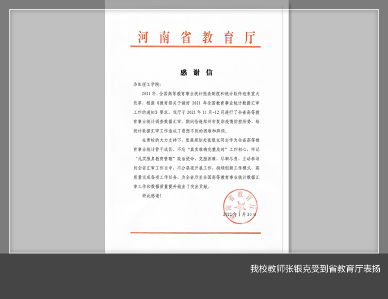 近日,河南省教育厅发来感谢信,表扬美高梅娱乐场
