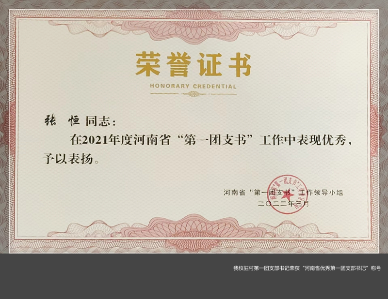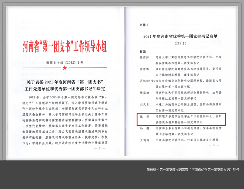 省派驻宜阳县香鹿山镇东韩村第一团支部书记张恒同志被授予“河南省优秀第一团支部书记”荣誉称号。