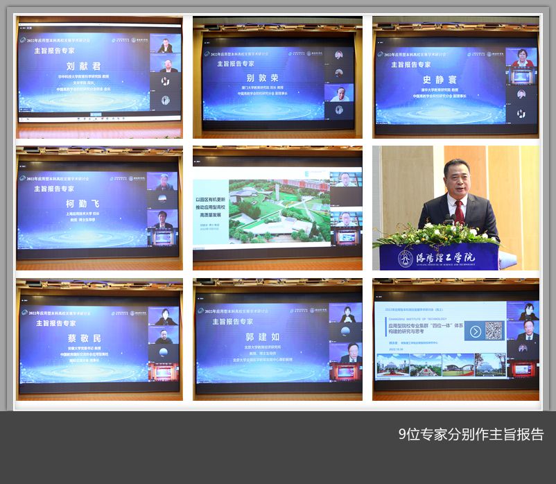 刘献君以《关于提升应用型人才培养质量的思考》为题,别敦荣以《新一轮普通高校本科教育教学审核评估方案解析——兼谈应用型高校的评建方略》为题,史静寰以《以学为本,以用为纲,以业为基:我国应用型高校学情调查工具设计理念解析》为题,柯勤飞以《“双协同”视角下高水平应用型本科高校产教融合机制创新与实践探索》为题,胡建波以《以园区有机更新推动应用型高校高质量发展》为题,张锐以《应用型本科高校高质量发展综合改革探索与实践》为题,蔡敬民以《中国应用型高等教育发展若干思考》为题,郭建如以《省属行业特色院校的创新发展与人才培养》为题,顾永安以《应用型院校专业集群“四位一体”体系构建的研究与思考》为题分别作主旨报告。余东升、张祺午、张凌云分别主持主旨报告。