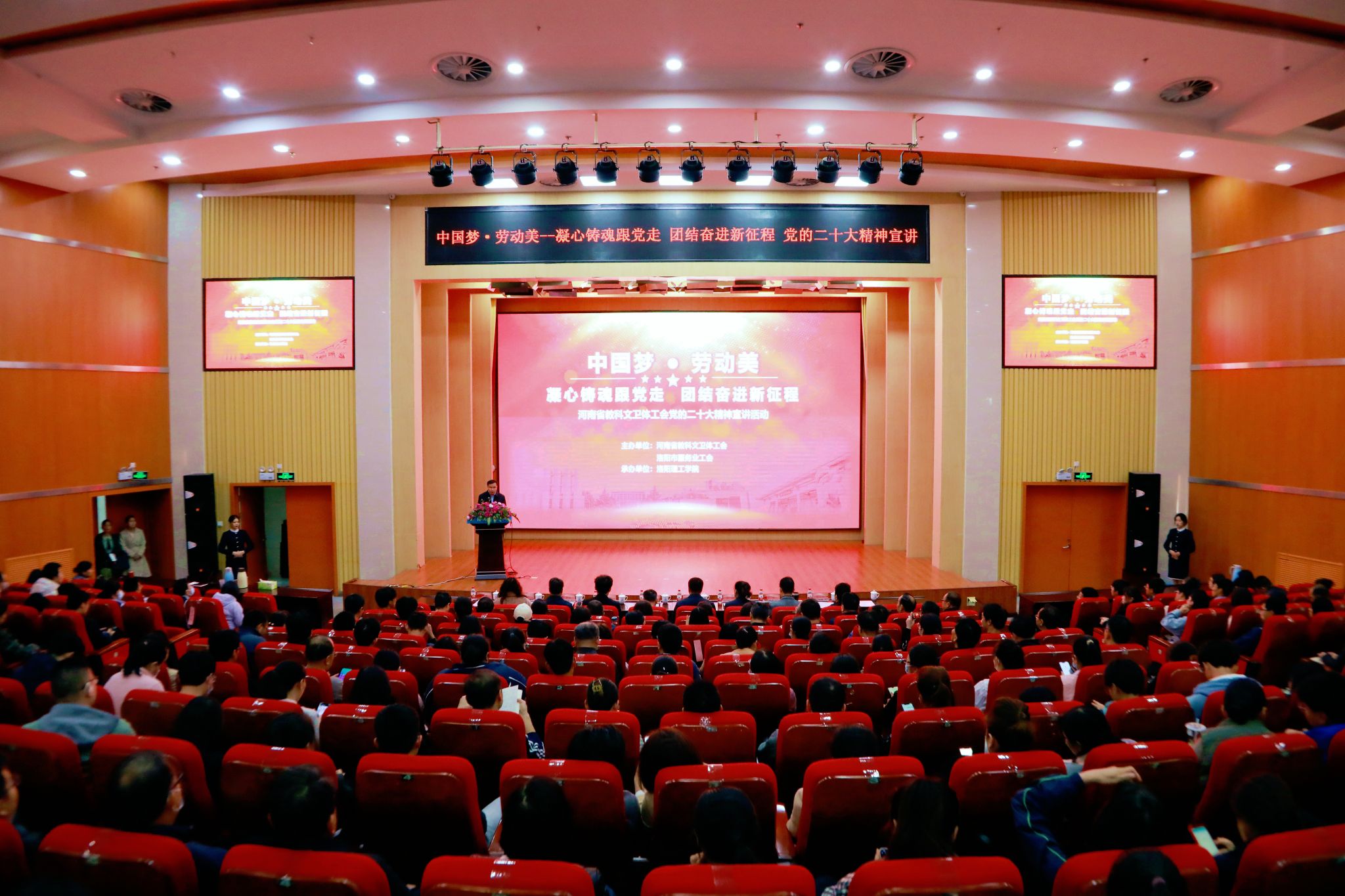 ,开展“中国梦·劳动美——凝心铸魂跟党走 团结奋进新征程”主题宣讲。河南省教科文卫体工会主席张学勇,洛阳市服务业工会主席王璟,校党委副书记、工会主席曾涛出席宣讲会,400余名工会干部、劳模先进代表、师生代表到场聆听。