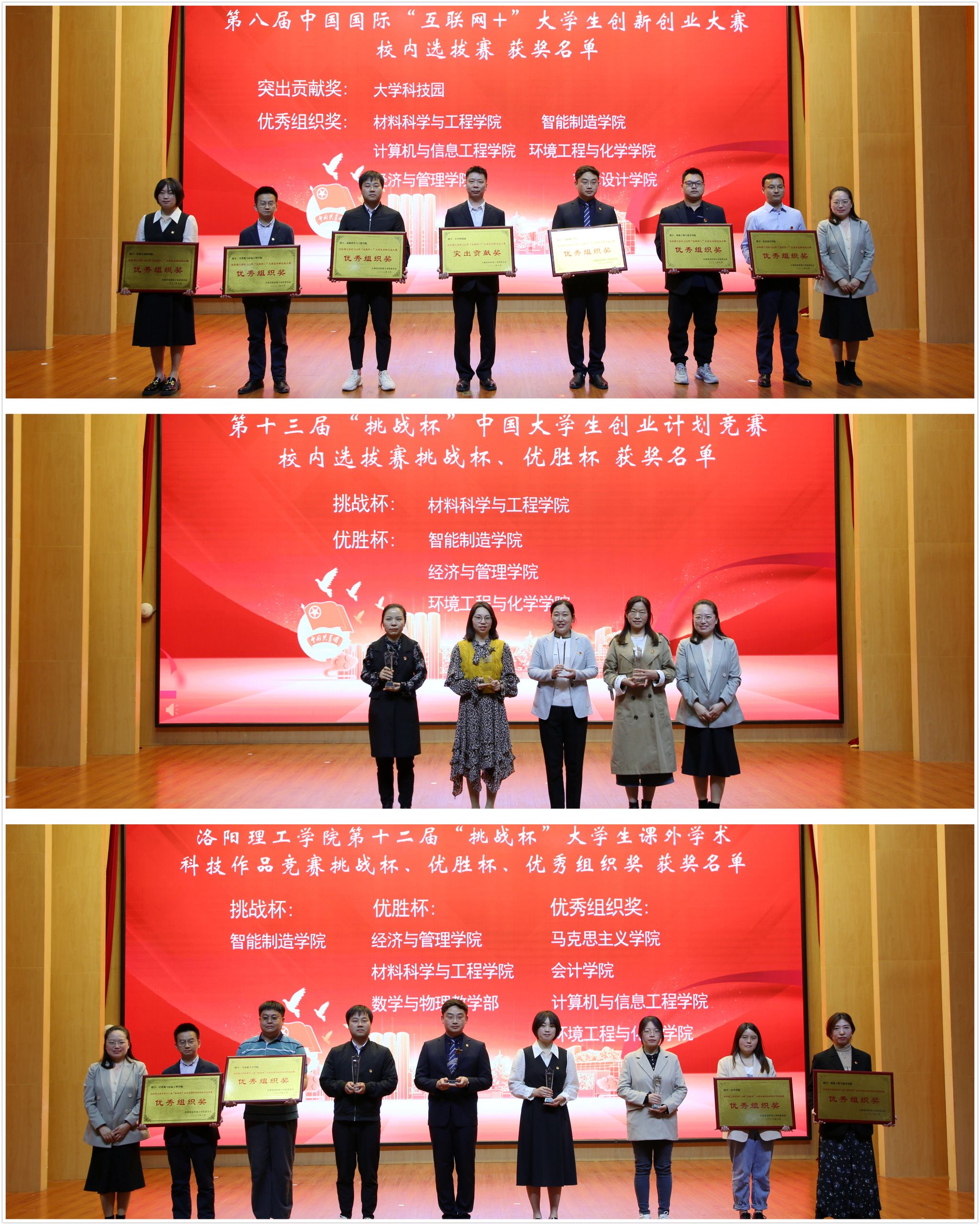 2022年科技创新重要赛事(中国国际“互联网+”大学生创新创业大赛、“挑战杯”大学生课外学术科技作品竞赛、“挑战杯”中国大学生创业计划竞赛)校赛获奖集体颁奖;为2022年志愿服务项目大赛、雷锋活动月等志愿服务活动获奖集体和个人颁奖;对一年来全校共青团工作中涌现的先进集体、优秀个人进行了表彰。大会共表彰“优秀团员”1003名、“模范团干部”354名、“五四红旗团支部”75个。经济与管理美高梅娱乐场