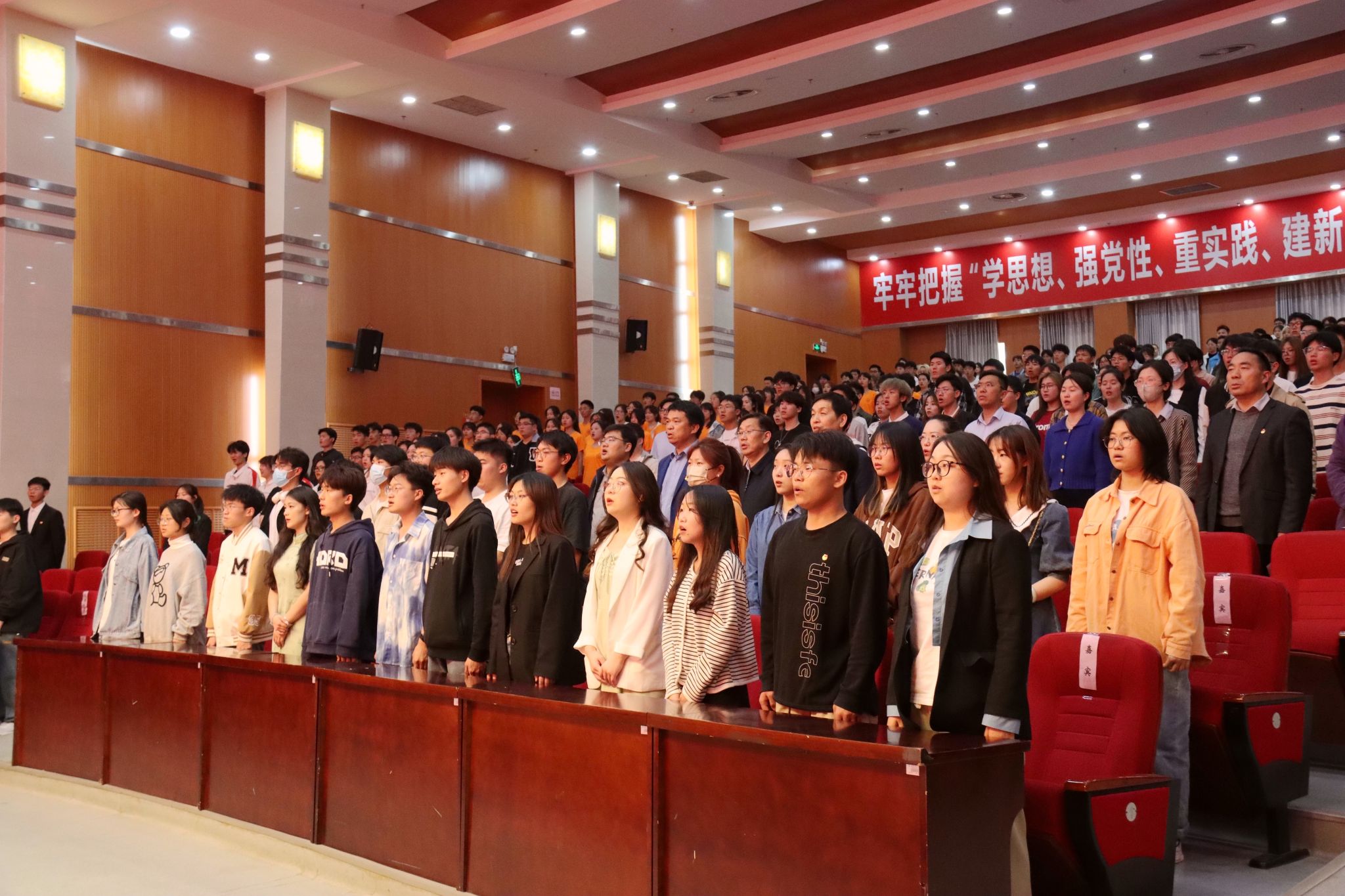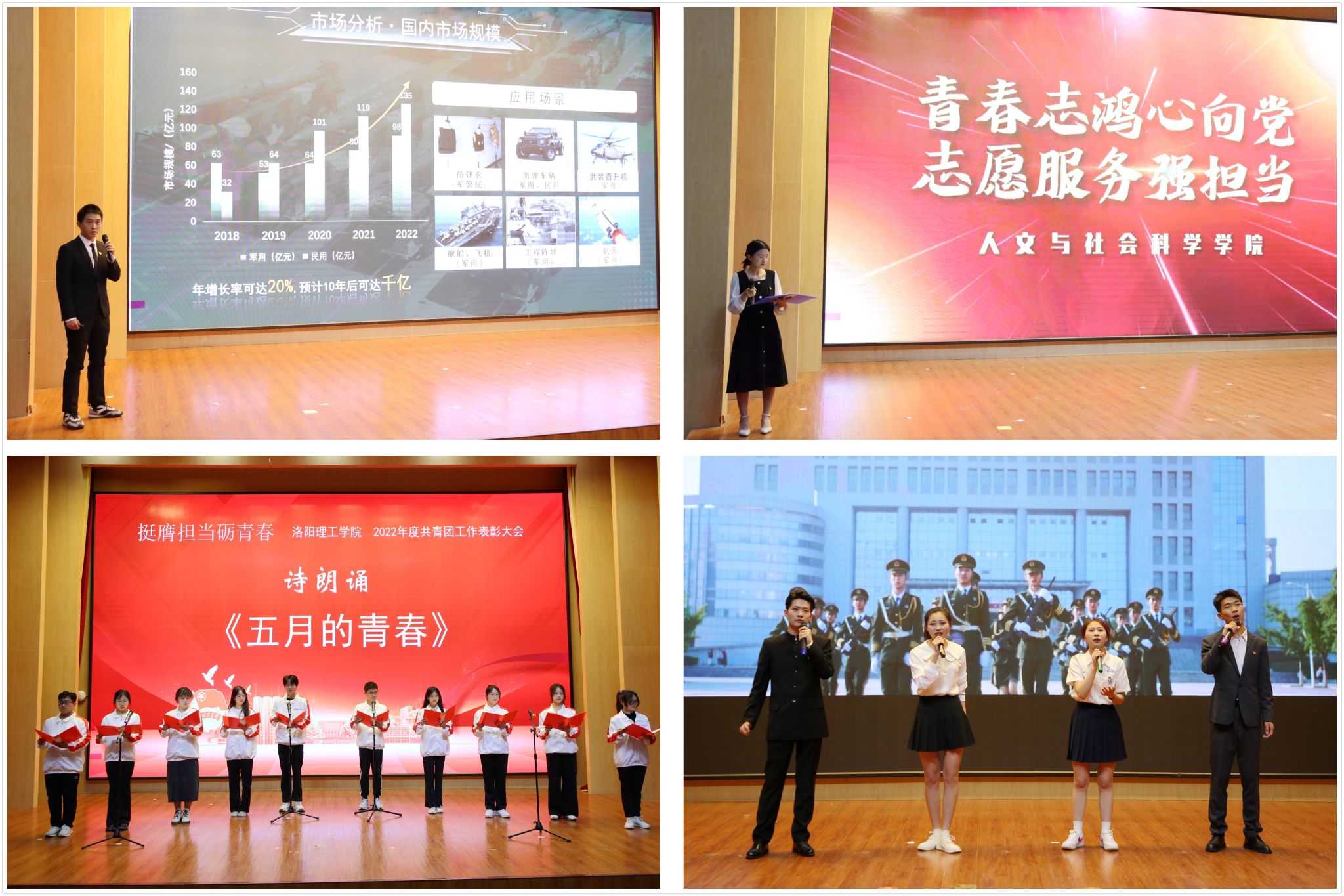 四名同学演唱的歌曲《强国一代有我在》,唱响了洛理工青年学子的家国情怀与责任担当。会上,青年团员代表面向团旗,重温入团誓词,伴随着《五月的花海》手势舞表演,大会落下帷幕。