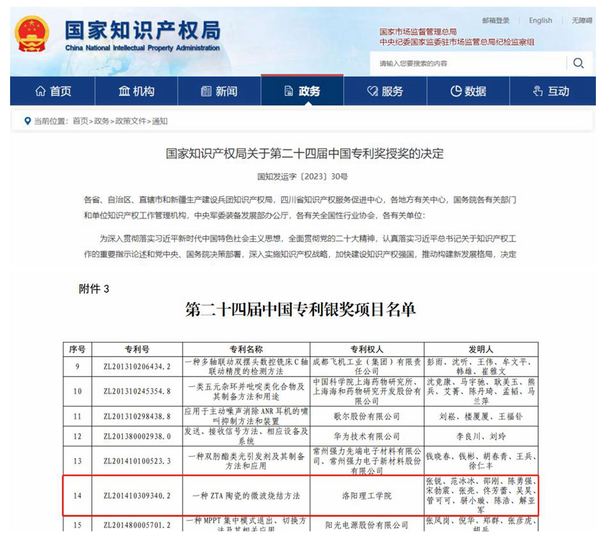 7月21日,国家知识产权局公布《国家知识产权局关于第二十四届中国专利奖授奖的决定》(国知发运字〔2023〕30号),美高梅娱乐场 张锐教授团队的专利“一种ZTA陶瓷的微波烧结方法(专利号:ZL201410309340.2)”荣获第二十四届中国专利奖银奖。美高梅娱乐场 成为河南省唯一且是全国同类院校中唯一获此奖项的高校,这是美高梅娱乐场 知识产权工作布局、保护、运用、管理等方面持续发力,全力推进高质量专利建设的成果。