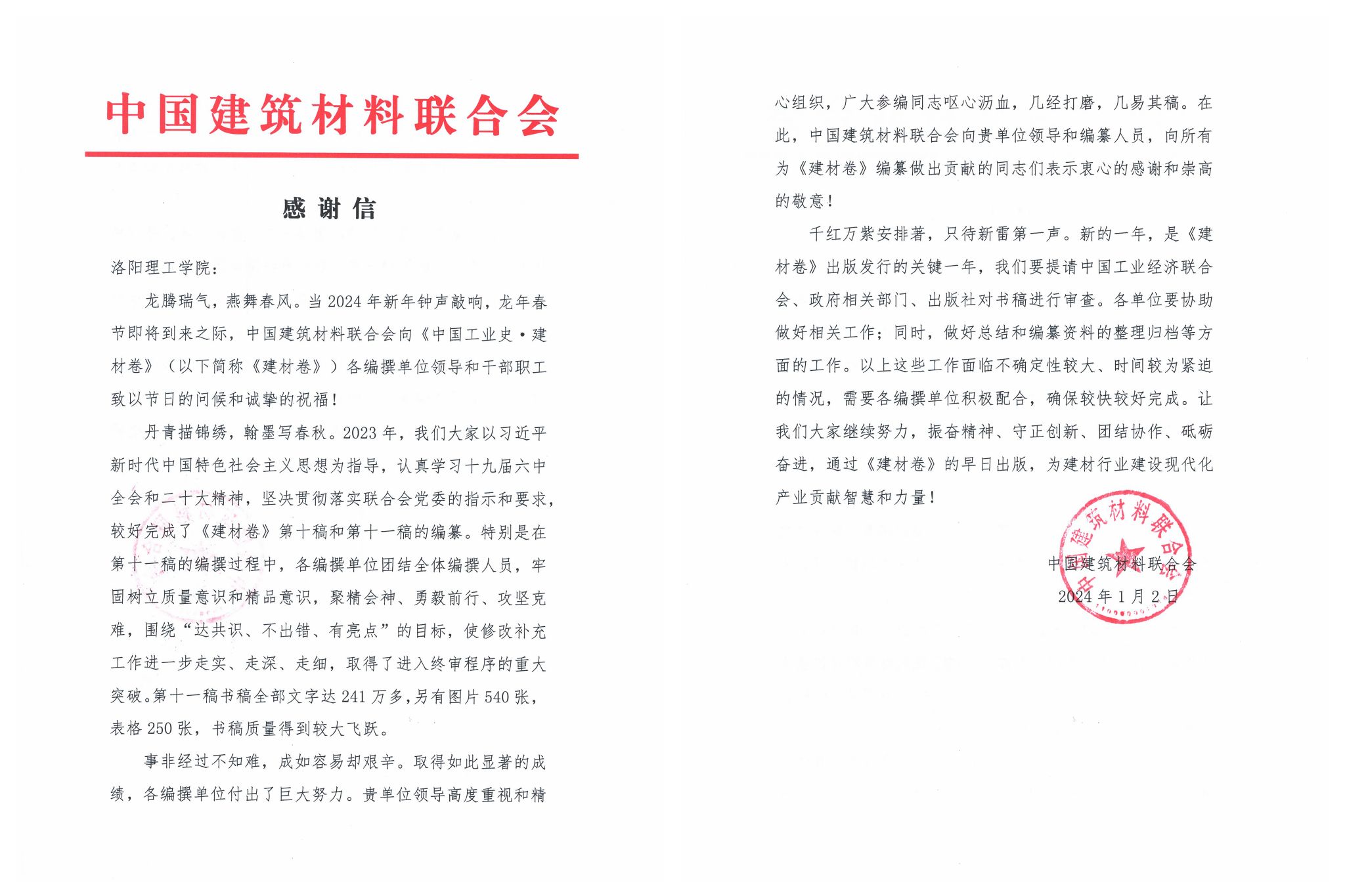 1月2日,中国建筑材料联合会向美高梅娱乐场 发来感谢信,对美高梅娱乐场 党委、行政精心组织和全力支持《中国工业史·建材工业卷》(以下简称《建材卷》)编纂工作表示感谢,对全体参编人员的辛勤付出表达感谢和敬意。