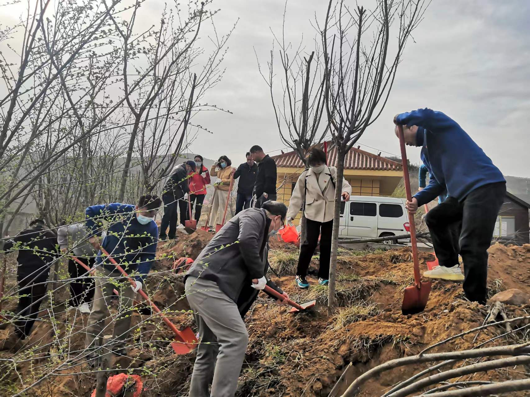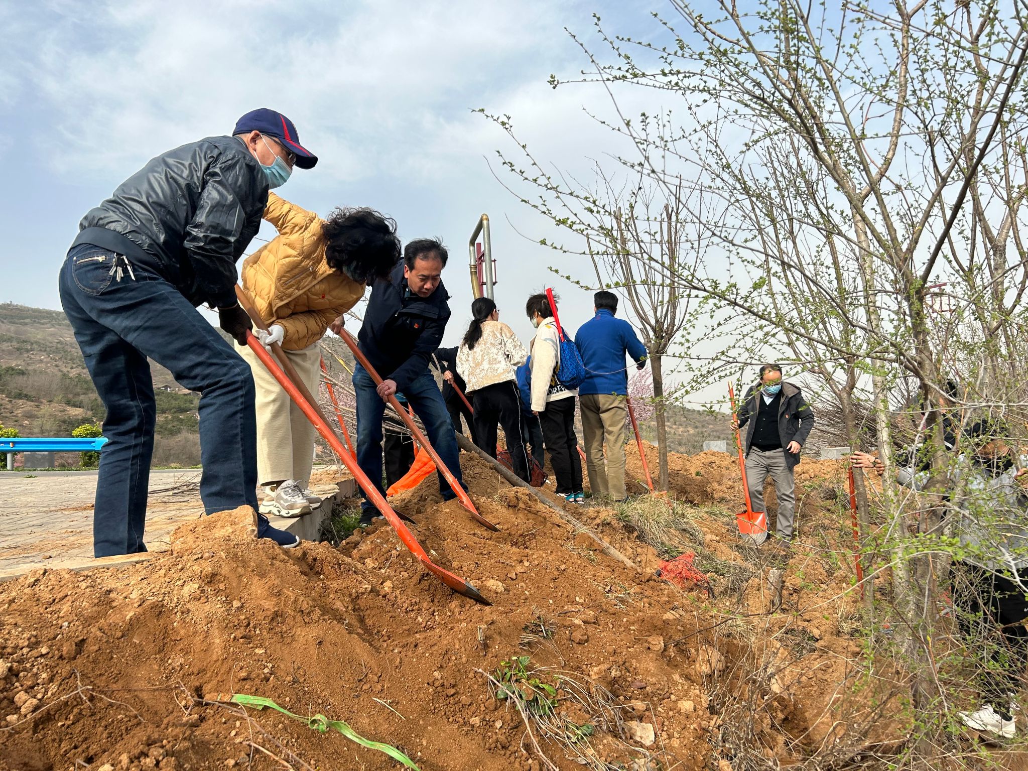 “这棵树再向右边移一点,我来扶一下。”“这地方陡峭,注意安全。”在植树活动现场,大家三两成组,分工协作、干劲十足,有齐心协力地共克难题,也有细致入微的关心提醒,大家认真按照植树的每一步工序,挥锹铲土、扶苗培土、回填压实,在陡峭的山坡边栽种下棵棵樱花树苗,增添了勃勃生机。