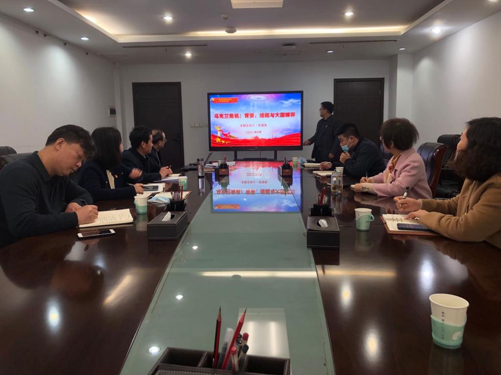 支部组织委员李海涛同志以《乌克兰危机:背景、缘起与大国博弈》为题讲授专题党课。他围绕国际秩序转型视野下的乌克兰危机,阐述了今年2月份以来的俄乌冲突情况,重点讲授了乌克兰历史演变进程、乌克兰危机爆发的动因和深层背景、乌克兰危机的影响与启示等问题。