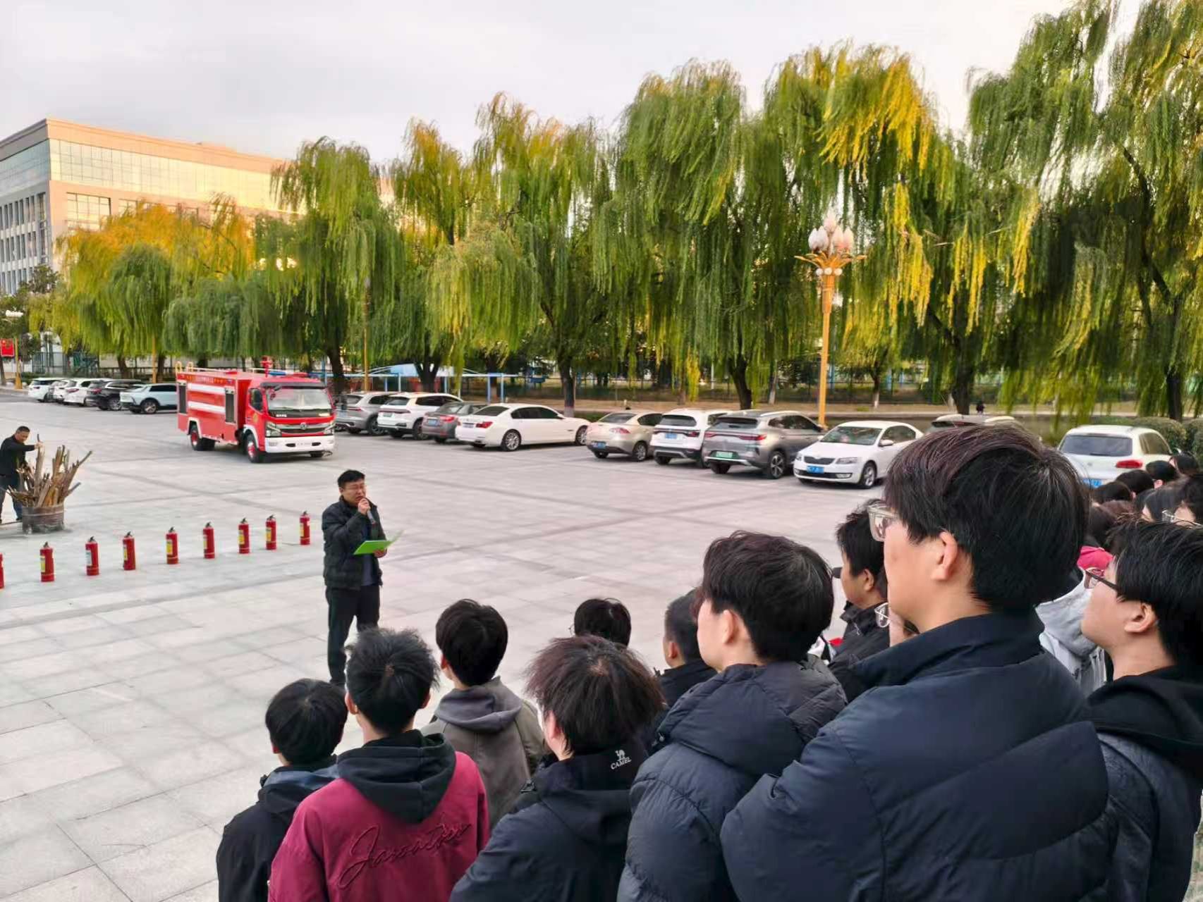 消防科负责人对演练过程进行了专业点评并讲解了消防安全知识,现场示范了干粉灭火器“提、拔、握、压”四步操作法和消防水带的连接与使用技巧,并重点强调了初期火灾扑救的黄金时间与安全距离。在灭火演练环节,师生们分组上阵,亲身体验灭火器操作与水带铺设,积极参与实战演练,切实将理论知识转化为实战技能。