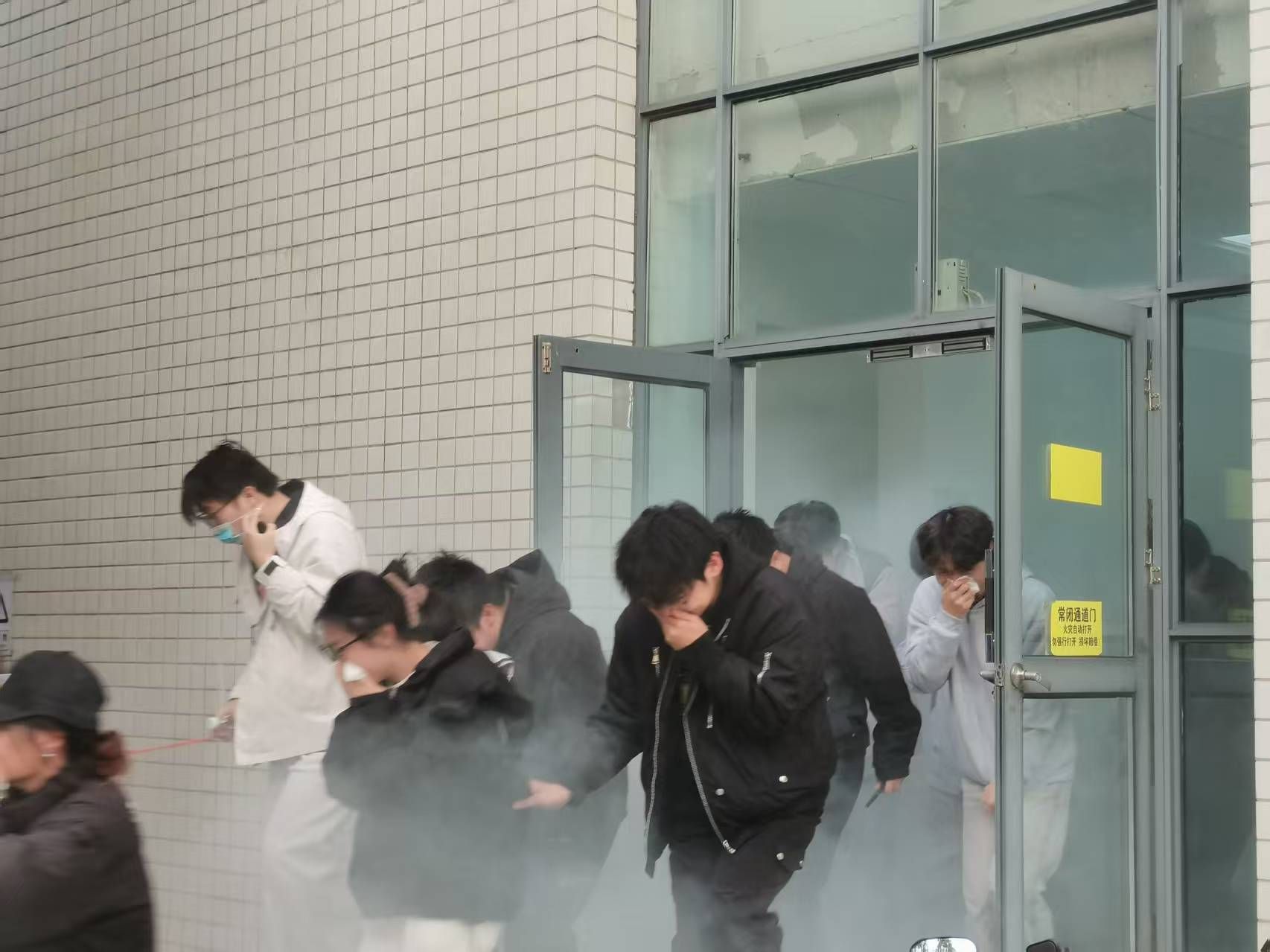 下午4时,通过人工拉烟装置模拟火情发生于实验室区域,现场浓烟弥漫,情况紧急。实验室管理人员第一时间发现“险情”,迅速启动应急预案,立即切断电源,并向应急指挥组报告。全体师生迅速响应,在现场指挥人员的引导下,用时3分钟全部安全抵达指定集合点。