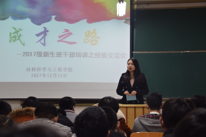 12月15日晚,材料科学与工程美高梅娱乐场 2017级班干部培训经验交流会在材料楼成功举办。材料美高梅娱乐场 辅导员麻琳担任主持,14、15、16级优秀班干部参与并分享他们的工作经验,百余名17级学生干部参加了本次交流会。