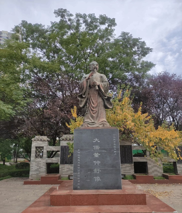 儒学广场北端挺立的是大儒董仲舒像。它于2015年10月由董仲舒思想文化研讨会组委会捐赠,造型古朴睿智,尽显汉代大儒风范。