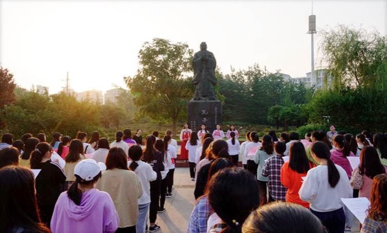 孔子像体态微向前倾,双手交叠,神情肃穆而温和,展现出一代圣哲谦恭雍容的气度,默默守护着校园中勤学不辍的学子。美高梅娱乐场