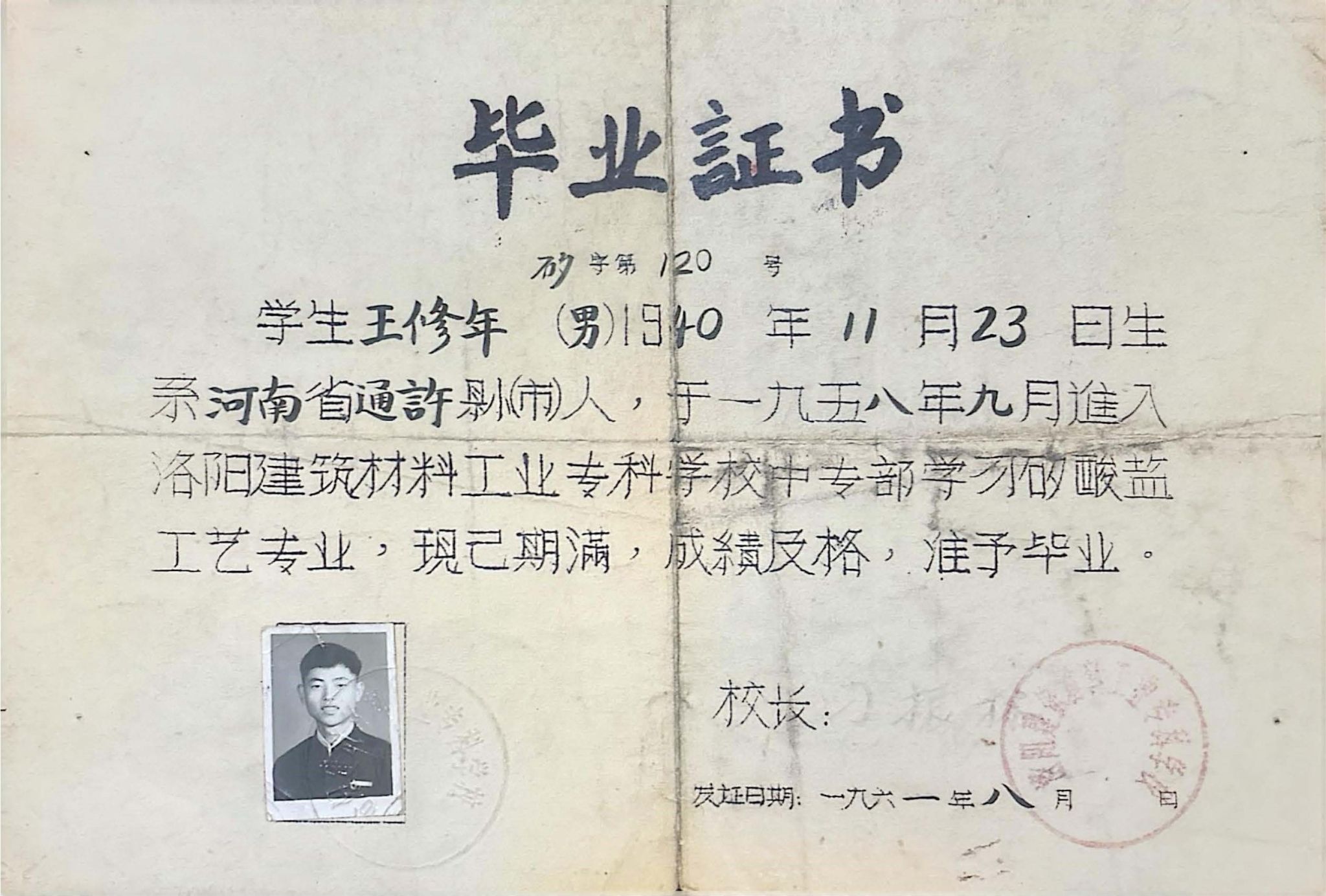 洛阳建材工业专科美高梅娱乐场 1958级毕业生王修年毕业证书