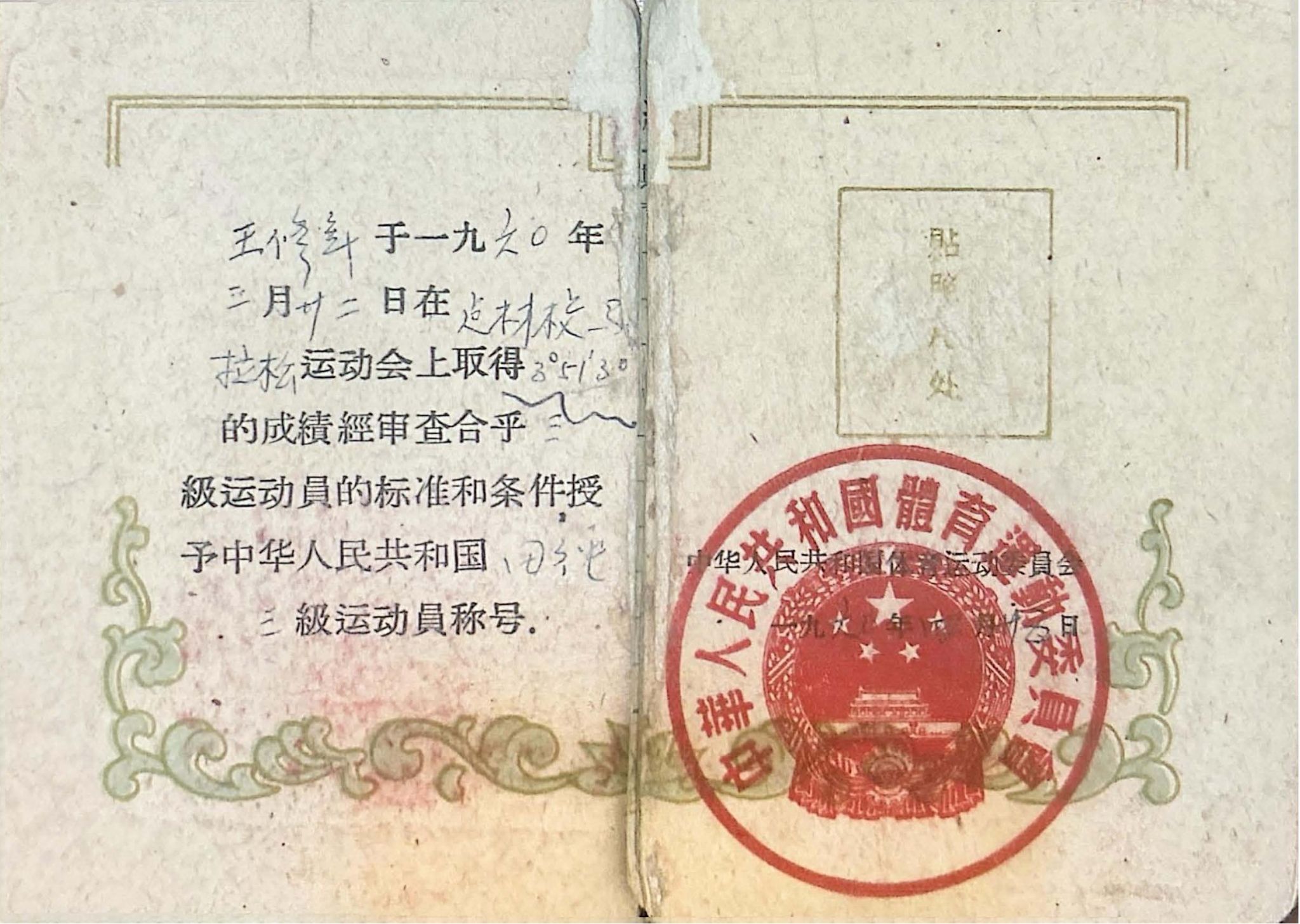 洛阳建材工业专科美高梅娱乐场 1958级毕业生王修年国家三级运动员证书