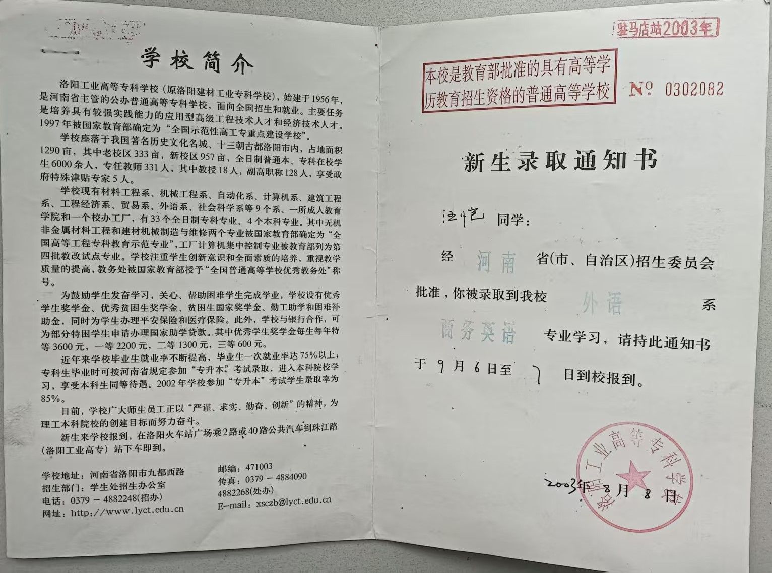 洛阳工业高等专科美高梅娱乐场 新生录取通知书