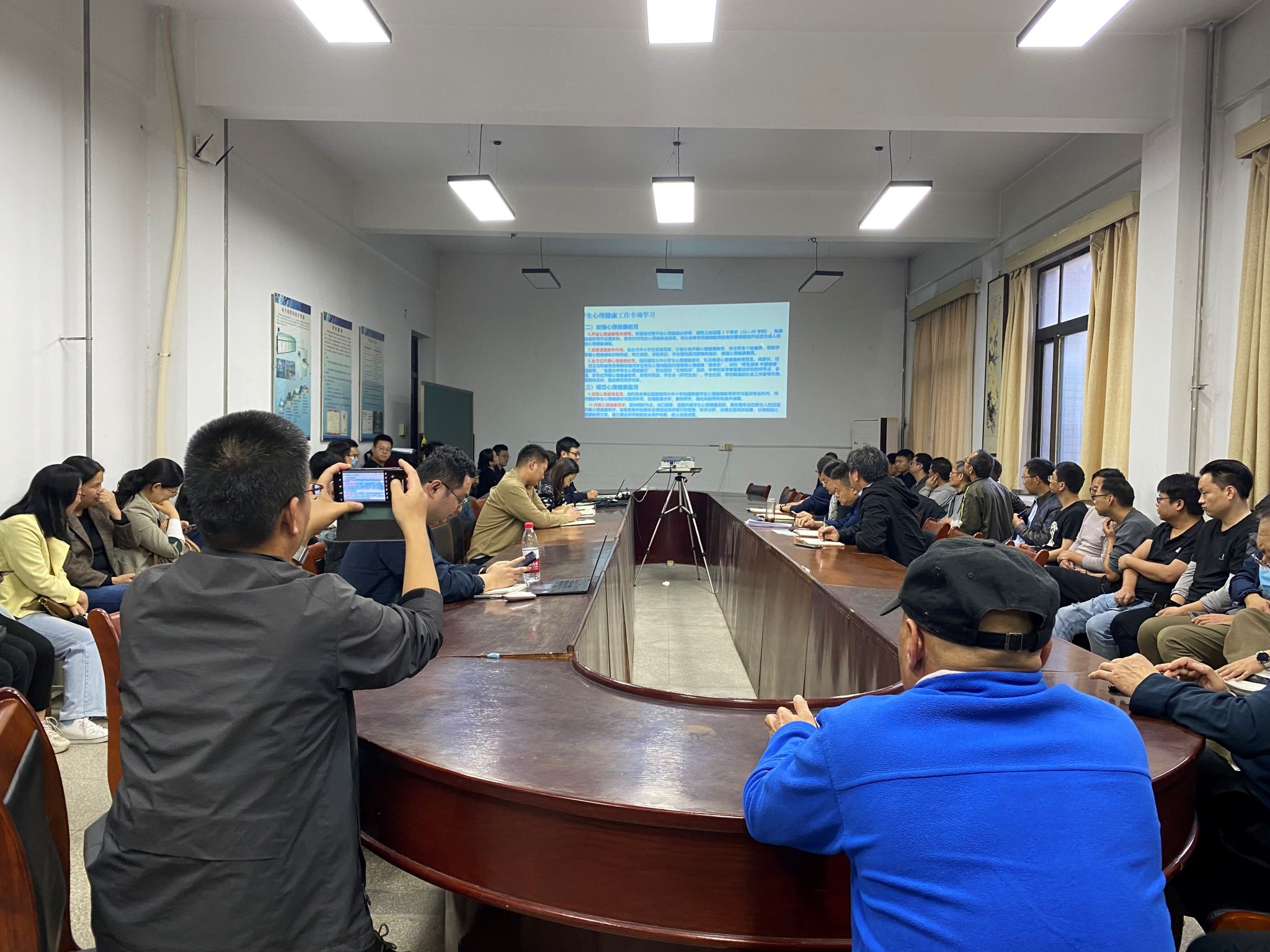 会议第二项,武超解读了教育部《全面加强和改进新时代学生心理健康工作专项行动计划(2023—2025 年)》文件精神,从总体要求、主要任务和保障措施三方面,使与会人员对文件的指导思想、基本原则、工作目标,部署开展的八项重点工作及三大保障举措有了深入了解。武超院长强调大学生心理健康教育要贯穿德育思政工作全过程,融入教育教学、管理服务和学生成长各环节,要求全体老师做延伸学生管理工作的手臂,支撑学生社会支持系统的构建,做到尽早发现、平稳交接、及时转介、全面覆盖、对症下药,全面提升心理健康教育水平,更好的赋能大学生健康成长。