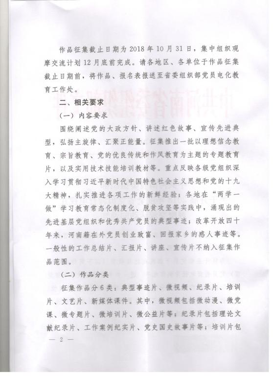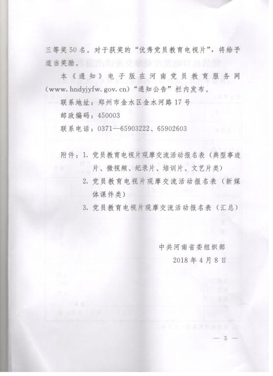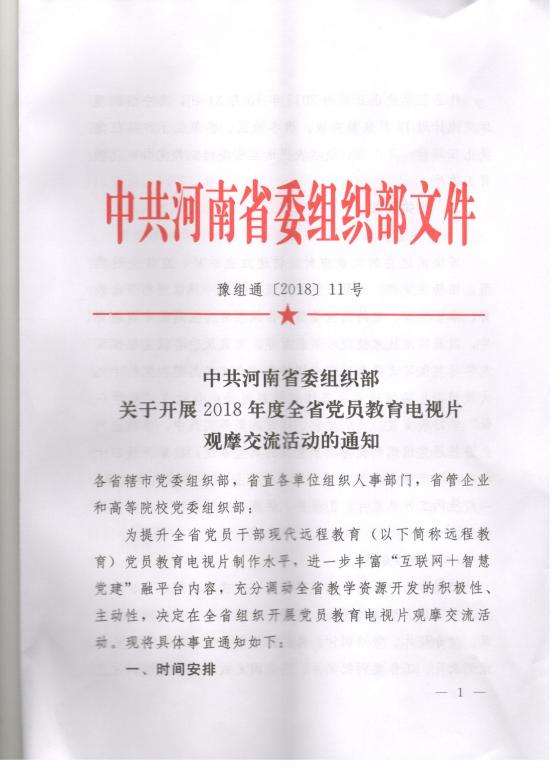 现将《中共河南省委组织部关于开展2018年度全省党员教育电视片观摩交流活动的通知》(〔2018〕11号))转发给你们,请按照通知要求认真做好作品报送工作。报送材料:报名表、作品,报送时间:2018年10月6日之前,报送地点:党委组织部组织科(王城校区办公楼405室),联系人:王敏 65928020。