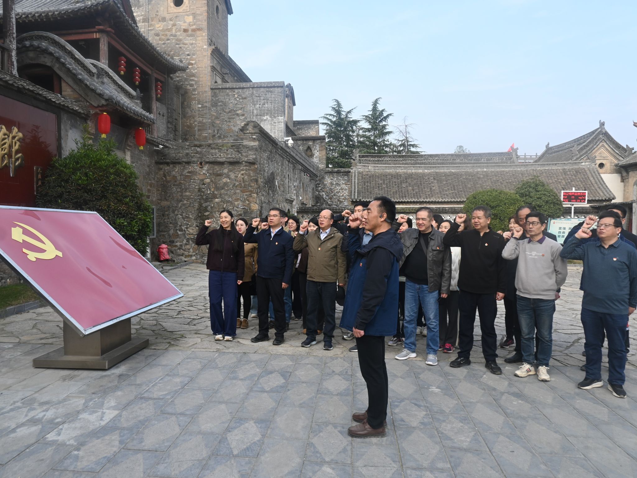 活动伊始,全体党员在纪念馆广场整齐列队,面向鲜红的党旗庄严肃立,举起右拳重温入党誓词。铿锵有力的誓言回荡在庄园上空,不仅是对入党初心的深刻回望,更彰显了全体党员坚守育人使命、勇担时代重任的坚定决心。