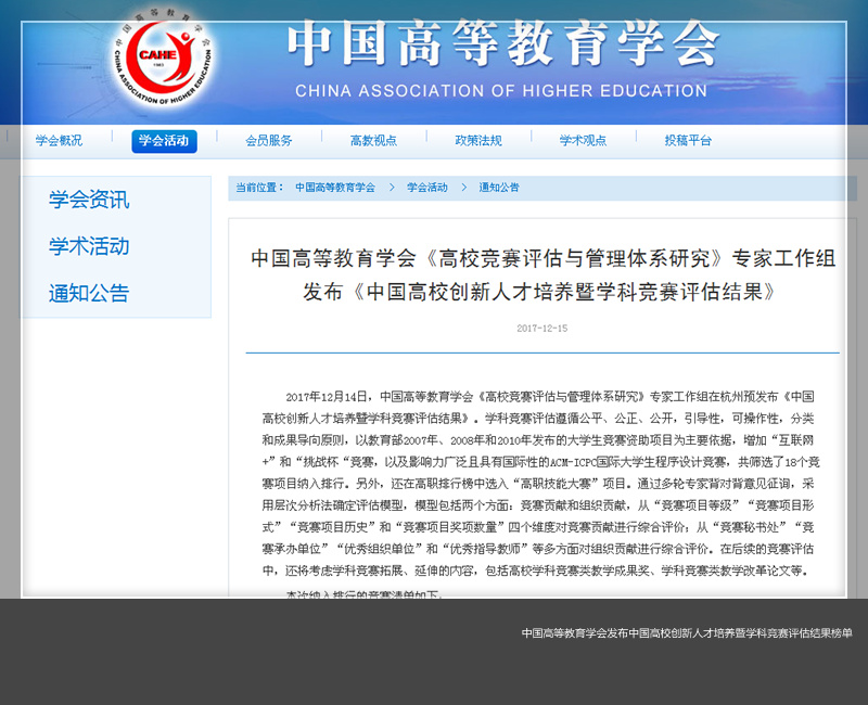 中国高等教育学会《中国高校创新人才培养暨学科竞赛评估结果》链接://www.hie.edu.cn/announcement_12579/20171215/t20171215_993709.shtml