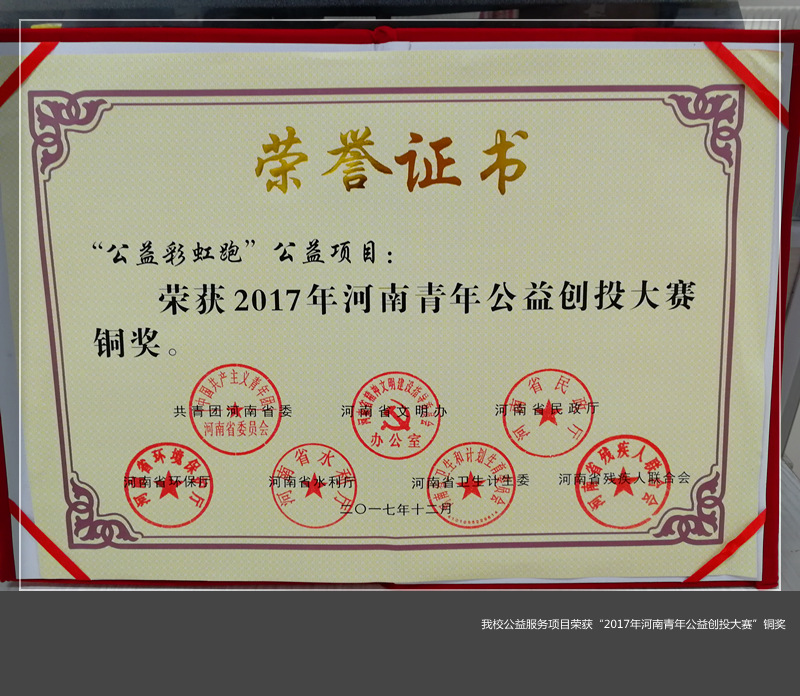 近日,由共青团河南省委联合省文明办、省民政厅、省环保厅、省水利厅、省卫生计生委、省残联等部门共同举办的“2017年河南青年公益创投大赛” 决赛在郑州举行。美高梅娱乐场 申报的‘公益彩虹跑’公益项目荣获大赛铜奖。