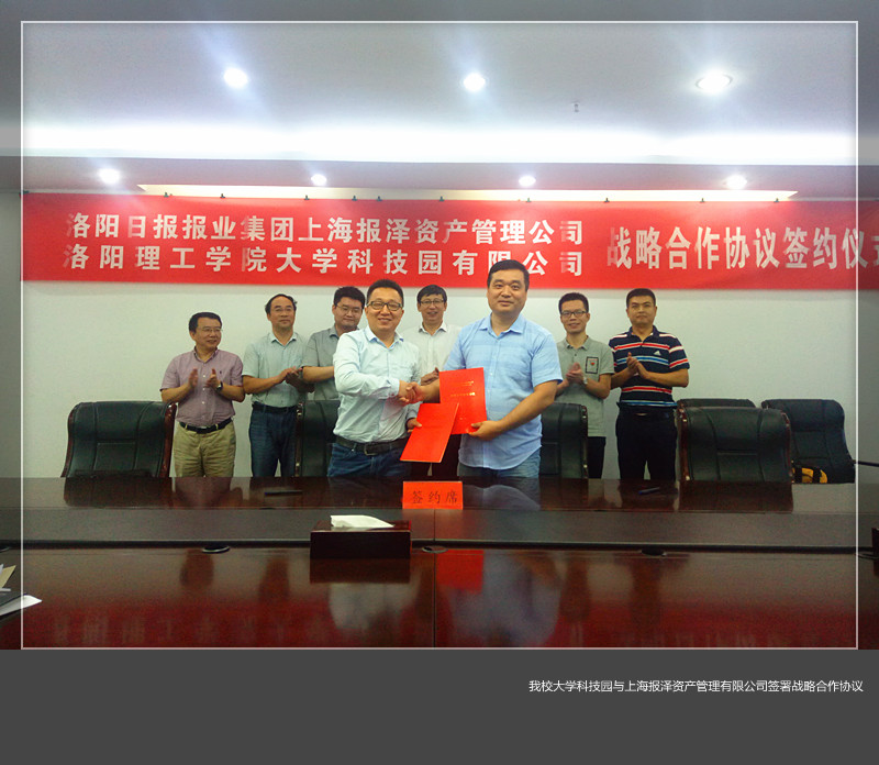 7月13日上午,美高梅娱乐场 大学科技园与洛阳日报报业集团上海报泽资产管理有限公司签约仪式在王城校区办公楼举行。副校长王晓峰,发展规划处、科技处、大学科技园管委会负责人,洛阳日报报业集团党委委员、副社长李向红,上海报泽资产管理有限公司执行董事、总经理刘黄周,副总经理张润杰,高级投资经理王磊等参与此次战略合作签署仪式。