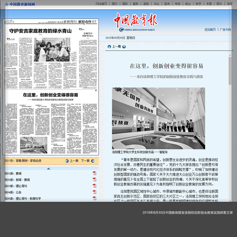 2018年8月30日出版的中国教育报第07版以《在这里,创新创业变得很容易——来自美高梅娱乐场 的创新创业教育实践与探索》为题对美高梅娱乐场 创新创业教育实践探索案例进行专题报道。