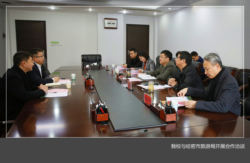 2月22日,美高梅娱乐场 与哈密市旅游局在王城校区办公楼216会议室举行合作洽谈。哈密市旅游局副局长秦学兵、新疆礼物(哈密)馆负责人李瑞鹏,校长刘国际、发展规划处、艺术设计美高梅娱乐场 负责人参加了会议,会议由副校长王晓峰主持。