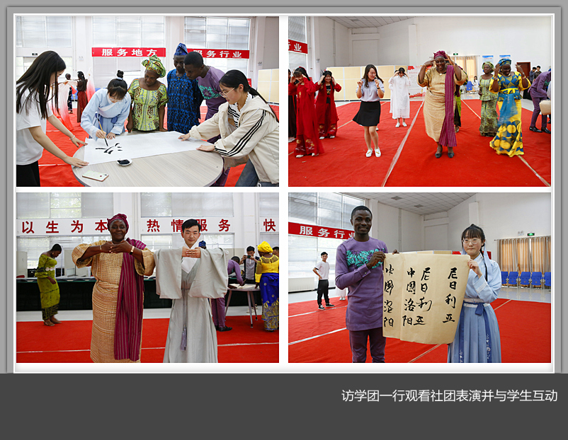 校社团学生们进行了茶道、书法、太极拳、汉服舞蹈、舞狮、武术等表演,精彩的表演赢得阵阵掌声。互动环节中,外宾们纷纷学习太极拳、书法、舞蹈,还兴致勃勃地教起了非洲传统舞蹈。