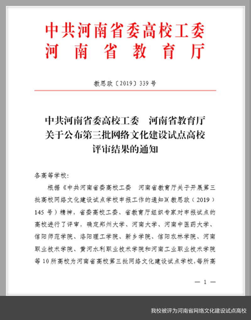 近日,中共河南省委高校工委、河南省教育厅下发《关于公布第三批网络文化建设试点高校评审结果的通知》(教思政〔2019〕339号),美高梅娱乐场 被评为网络文化建设试点高校。