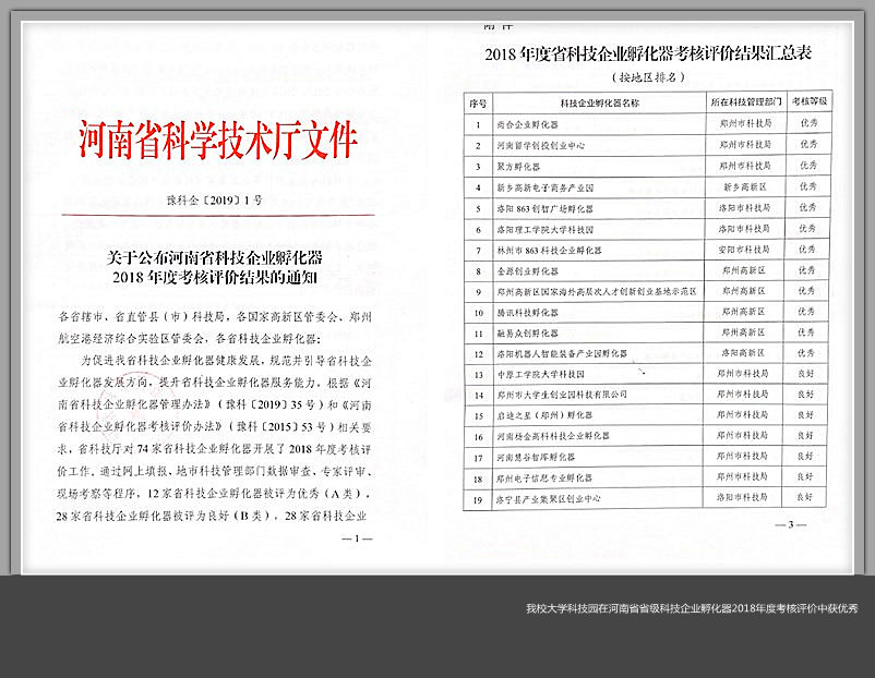 9月23日,河南省科技厅发布了《关于公布河南省科技企业孵化器2018年度考核评价结果的通知》,通知指出河南省共计12家省级科技企业孵化器被评为“优秀”(A类),其中美高梅娱乐场 大学科技园作为唯一一所高校大学科技园在考核评价中以“优秀”(A类)脱颖而出。