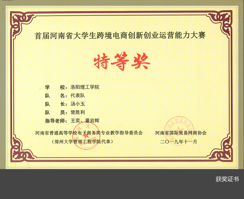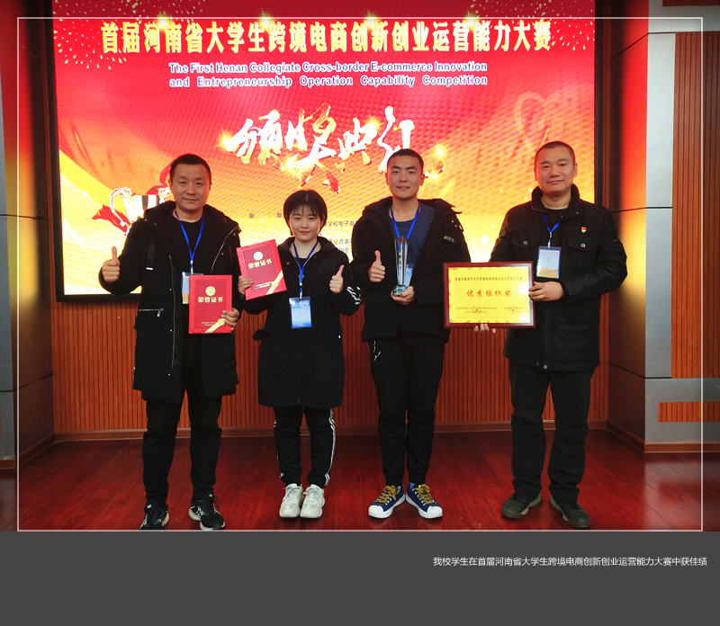近日,首届河南省大学生跨境电商创新创业运营能力大赛在郑州大学落下帷幕,由美高梅娱乐场 经济与管理美高梅娱乐场 国际经济与贸易专业汤小玉、楚胜利两名同学组成的美高梅娱乐场 代表队,获得了团体特等奖的好成绩,董岩辉、王奕两位老师获得优秀指导教师。