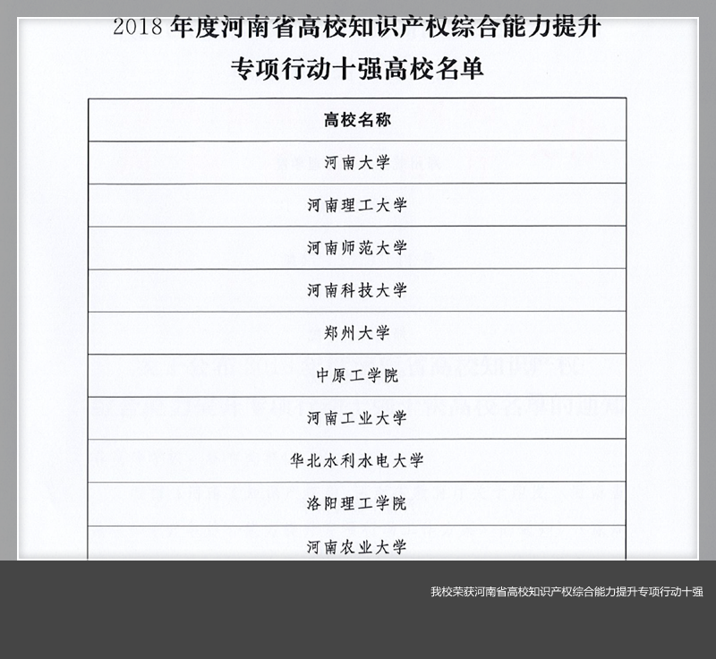 日前,河南省知识产权局、河南省教育厅联合印发通知,公布2018年度河南省高校知识产权综合能力提升专项行动十强十快高校名单。美高梅娱乐场 荣获2018年度高校知识产权综合能力提升专项行动十强高校,这是美高梅娱乐场 连续三年入选河南省高校知识产权综合能力提升专项行动十强十快高校名单。