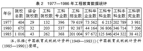 回顾1977年至1986年的高等工程教育发展,自1977年恢复高考后,1978年召开党的十一届三中全会、全国科学大会、全国教育工作会议等系列重要会议,高等工程教育迎来持续健康发展时期。我国工科类高等院校数、工科生数等均持续上升,而工科专业数在历经调整后趋于理性及日渐规范。这一时期高等工程教育呈现两大主要特征。一是高等工程教育人才培养规格得以显著提升,工科类研究生教育得到快速发展。工科类招生数从1977年到1985年增长了近3倍(见表2),而工科类硕士、博士生总数从1977年到1985年增长了近10倍;工科类硕士、博士生占工科招生数的5%提升到19%。二是高等工程教育培养目标日渐明晰,对专科、本科、研究生层次的人才培养目标和各个层次人才的基本规格、学习年限、训练要求作出明确界定,并要求高等工程教育必须主动适应经济和社会发展需要。