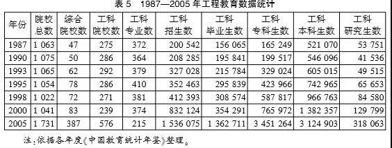 这一时期高等工程教育呈现3个方面主要特征。一是工科类高校和工科学生数增幅较大,注重高等工科类应用人才培养。工科类高等院校数,在这一期间虽历经多次波动,但在21世纪后呈现大幅上升态势。各类工科学生数不断上升,尤其是体现应用人才培养导向的工科专科生数量增幅高达20倍(见表5);同时设置工程硕士专业学位,强化高等工程高层次应用人才培养。二是调整优化工科专业,注重宽口径培养。高等工科专业数量1987年为372个,到1995年进入高峰期为410个,到2005年则调整为215个,缩减了47.6%的专业数。工科专业数先上升后下降,逐步规范趋于合理。(见表5)三是注重高等工程教育质量。通过建设高等工科基础课程教学基地、强化本科(工科)教学精品课程建设等,注重高等工科类人才培养的教学质量;同时通过建设工程(技术)研究中心、重点实验室、强化本科(工科)教育教学改革项目建设等,不断破解实践教学和工程训练不足的现实问题,也是对1985年建立的高等工程教育评估制度实施后提出的整改建议的有效反馈。