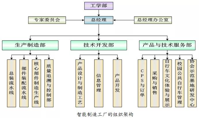 智能制造工厂由生产制造部、技术开发部、产品与技术服务部、专家委员会和总经理办公室等部门构成。各部门由若干专业团队组成。