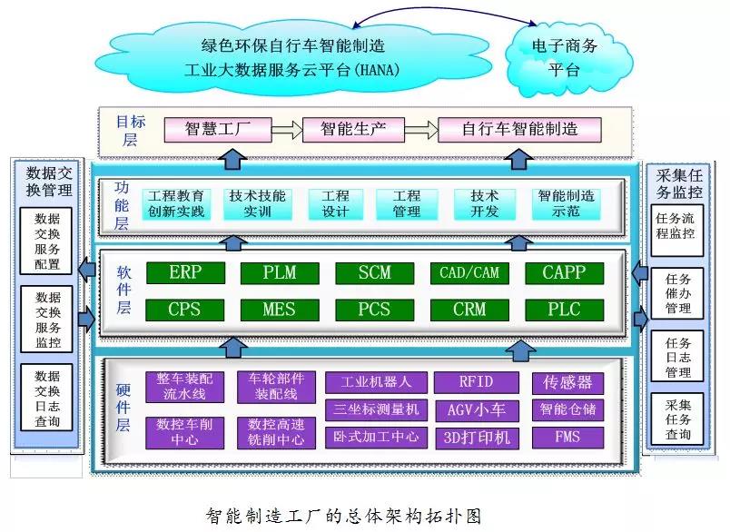 智能制造工厂总体架构由管理层、硬件层、软件层、功能层、目标层、数据交换和任务监控、云平台等组成。