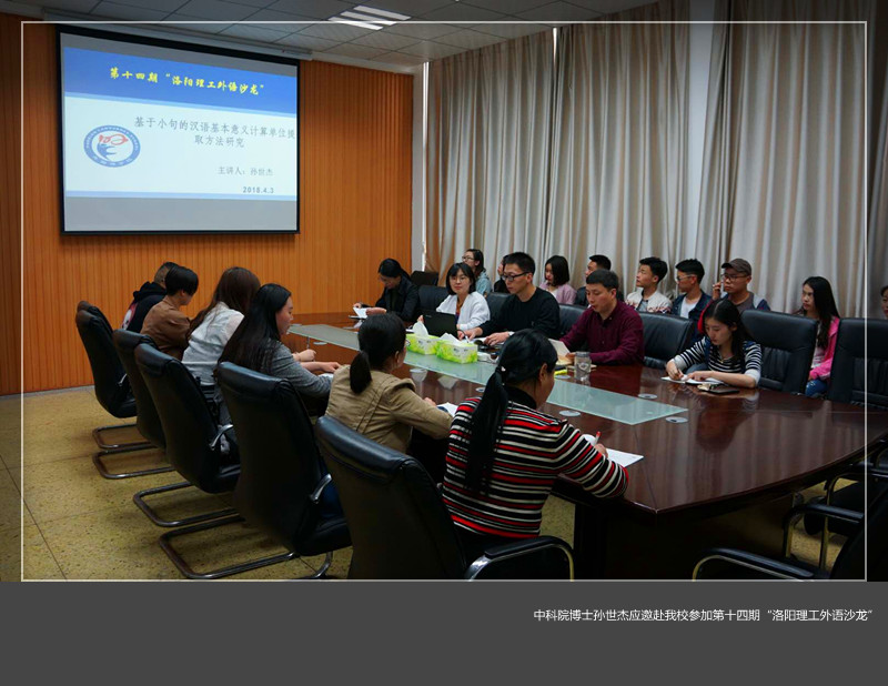 4月3日,中科院博士孙世杰应邀赴美高梅娱乐场 参加第十四期“洛阳理工外语沙龙”,为外国语美高梅娱乐场 师生作了题为“基于小句的汉语基本意义计算单位提取方法研究”的讲座。