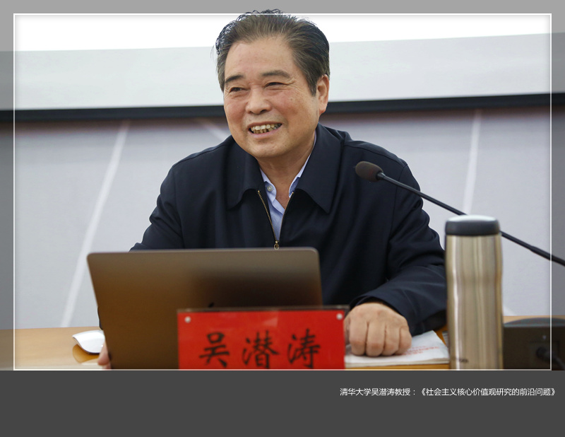 吴潜涛教授在报告中说,要在正确精准把握党的十九大精神中理解社会主义核心价值观。他从新成就和新变革、新时代和新使命、新思想和新方略、新战略和新布局四个方面阐述了党的十九大的理论创新问题。吴潜涛强调,要从宏观层面、从几对关系中准确把握社会主义核心价值观。社会主义核心价值观在本质上是社会主义核心价值体系的一个有机组成部分,是对社会主义核心价值体系的概括和凝练,是为满足社会主义核心价值体系大众化的需要而提出来的;思考和把握社会主义核心价值观的要义,应当从更全面、更宽广的视角去理解;社会主义核心价值观是当前社会各界在社会主义核心价值观问题上最大的公约数。在谈到文化自信时吴潜涛提出,“越是民族的,就越是世界的”,践行社会主义核心价值观必须要弘扬优秀传统文化,要在传统文化的创造性转换与创新新发展上下功夫,要运用哲学的普遍性与特殊性原理对社会主义核心价值观进行再思考、再凝练,思考如何把抽象的价值观念与具体的价值观念有机结合起来。吴潜涛教授就当前理论界关心的人类命运共同体谈了自己的见解,他指出,人类命运共同体旨在建设一个合作共赢、和平发展的世界,为世界的发展提供中国智慧和中国方案。