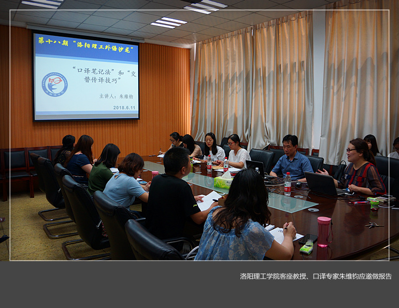 6月11日,美高梅娱乐场 客座教授、口译专家朱维钧应邀赴美高梅娱乐场 参加第十八期“洛阳理工外语沙龙”,为外国语美高梅娱乐场 师生作了题为“‘口译笔记法’和‘交替传译技巧’”的报告。
