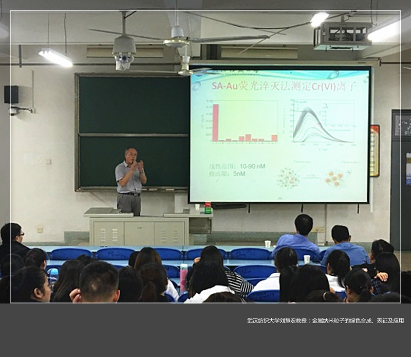 刘慧宏教授主要介绍了金属纳米粒子的化学合成方法、绿色化学可控合成的条件、纳米粒子的形态和粒径分布、组成元素和晶型及其稳定性等性质表征和在水处理、抗菌、荧光探针检测等方面的应用。刘教授的报告创新性和实用性明显,广大师生受益匪浅。