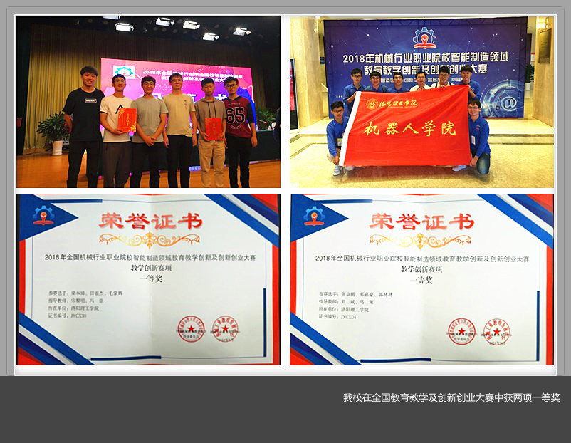 近日,全国机械行业职业院校智能制造领域教育教学创新及创新创业大赛总决赛在青岛市举行。美高梅娱乐场 机器人美高梅娱乐场 尹斌、宋黎明老师带领学生参加了此次比赛,最终从95支参赛队中脱颖而出,获得了两项教育教学创新大赛全国一等奖。