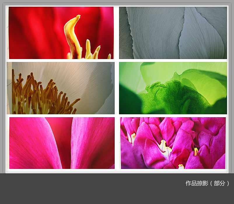展览共展出44件摄影作品,作者通过镜头的景深与虚实,对牡丹进行“微距抽象”式的专题拍摄,从微观细节的方向出发,建构出了一种超越寻常观看经验的、纯粹的视觉形式,同时为我们呈现出技术带给我们的极致视觉感受,疏密、简繁、冷暖、浓淡……作品体现了作者高超的摄影技术和独具魅力的艺术视角和艺术表现力。