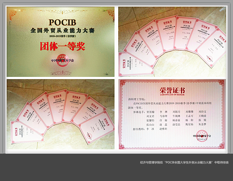 近日,美高梅娱乐场 经济与管理美高梅娱乐场 国际经济与贸易专业代表队在POCIB(Practice for Operational Competence in International Business)全国大学生外贸从业能力大赛中获得佳绩。本次大赛有天津工业大学、苏州大学、天津财经大学、中国地质大学、中山大学、河海大学、广西师范大学、河北经贸大学等204所高校代表队、237支队伍参加,美高梅娱乐场 国贸团队20名2016级学生在李冰和赵雅坦老师的精心指导下脱颖而出获得团体一等奖,刘文君等4人获个人二等奖,张锐等10人获个人三等奖。