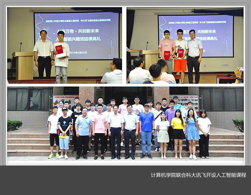 6月25日,由计算机信息工程美高梅娱乐场 联合科大讯飞洛阳语音云创新研究院联合开设的《AI连万物,共创新未来》人工智能课程结课典礼在计算机美高梅娱乐场 举行。科大讯飞洛阳语音云创新研究院执行院长闫润强、运营总监张四伟及计算机美高梅娱乐场 负责人出席结课典礼,并为兴趣班优秀学员颁发证书。